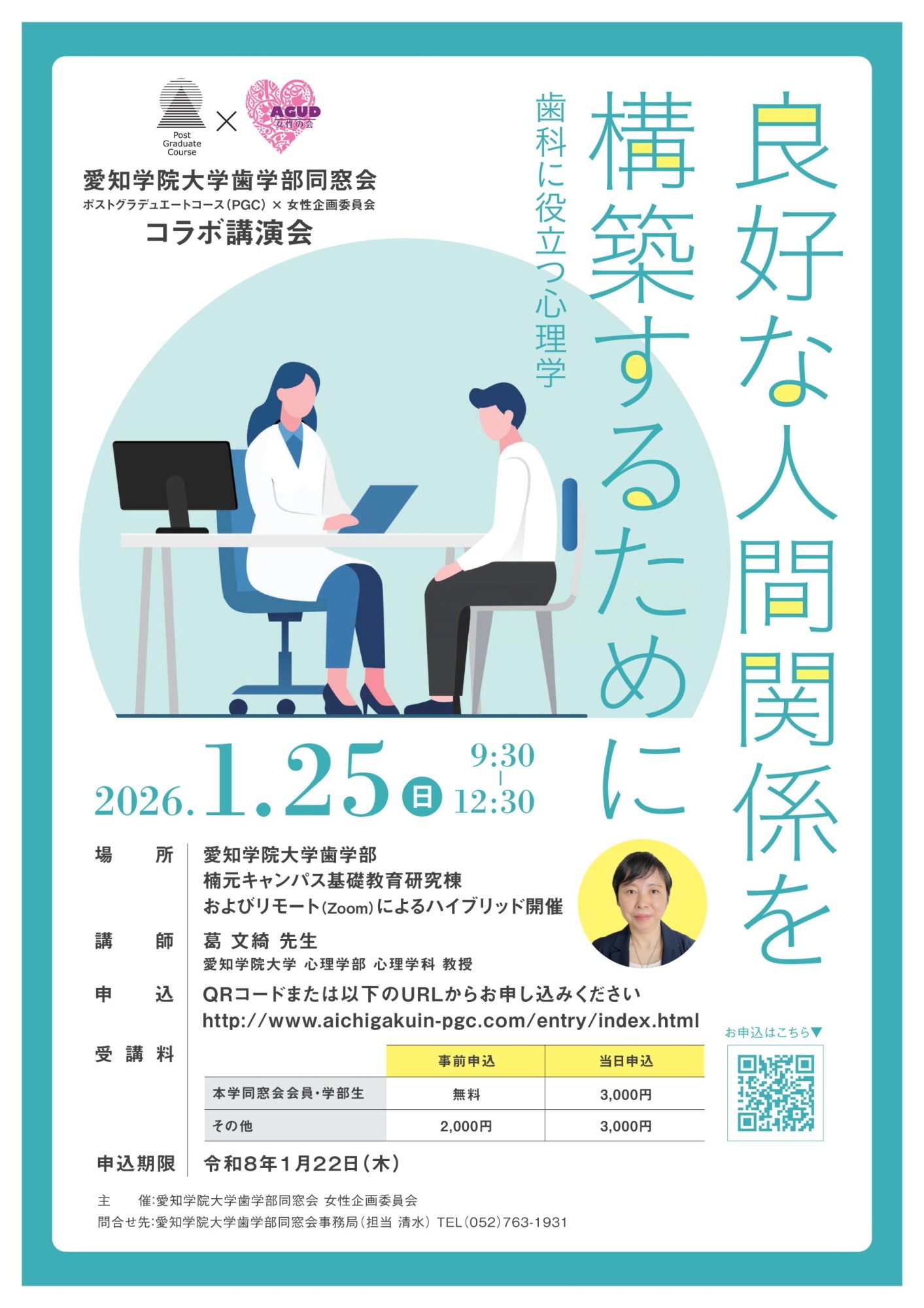 歯学部同窓会ポストグラデュエートコース(PGC)と女性企画委員会のコラボ講演会が開催されます。